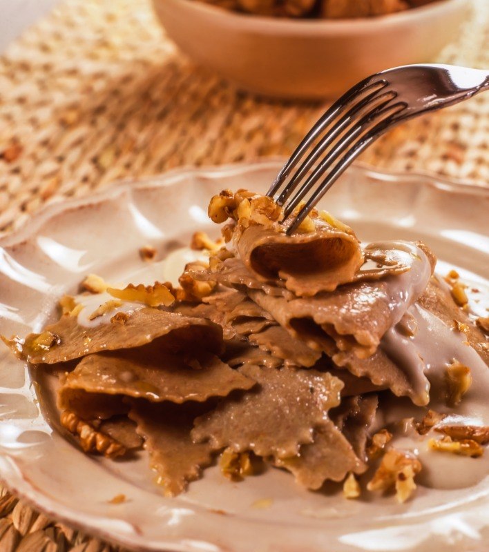 FAZZOLETTI DI GRANO SARACENO CON CREMA DI FORMAGGIO NOCI E CASTAGNE