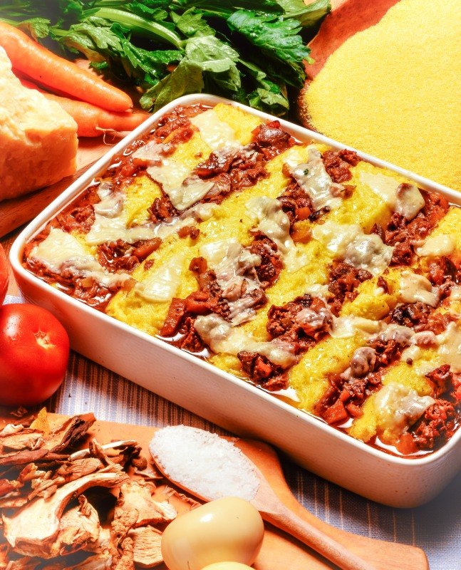 POLENTA PASTICCIATA Ingredienti per 4/6 persone: 400 g di polenta pronta, 1 costa di sedano, 1 carota, 1 cipolla, 150 g di polpa di vitello, 150 g di soppressa, 150 g di funghi porcini freschi, 100 g di burro, 3 cucchiai d’olio extravergine d’oliva, 2,5 dl di vino bianco secco, 400 g …