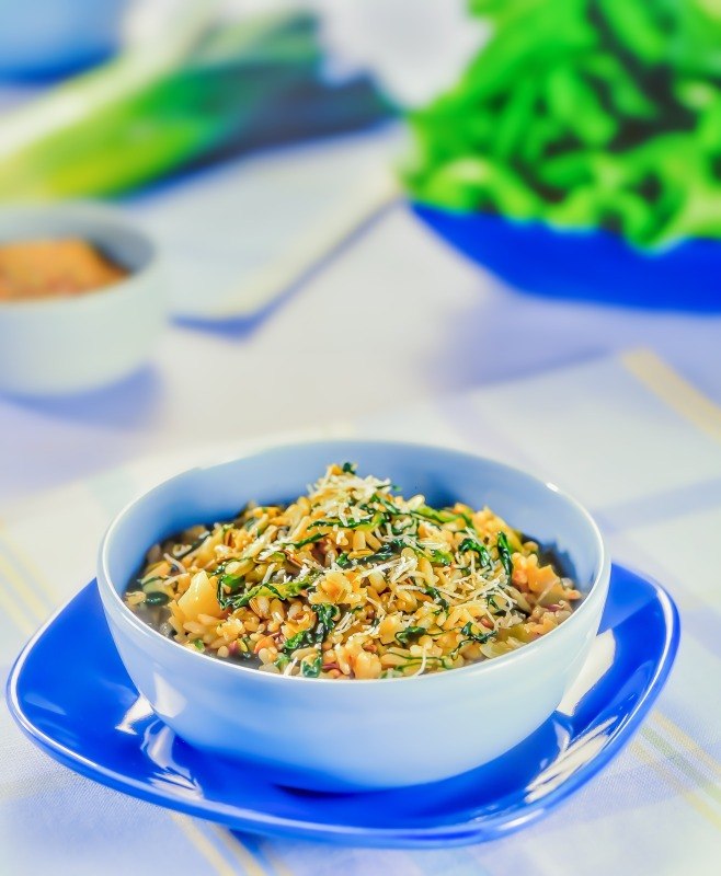 Ingredienti per 4 persone: 300 g di riso integrale, 1 porro, 1 grossa lattuga, 1 patata, 1 cucchiaino di semi di finocchio, brodo vegetale, 30 g di formaggio grattugiato, 50 g di burro, sale, pepe