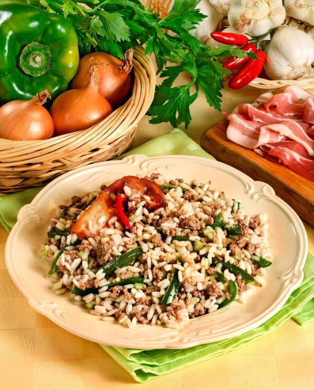 Ingredienti per 4 persone: 320 g di riso, 100 g di polpa di maiale tritata, 4 fette di pancetta affumicata, 1 lt di brodo di pollo, 2 peperoni verdi, 1 cipolla, 1 cipollotto, 2 cost di sedano, 10 g di burro, 1 spi…