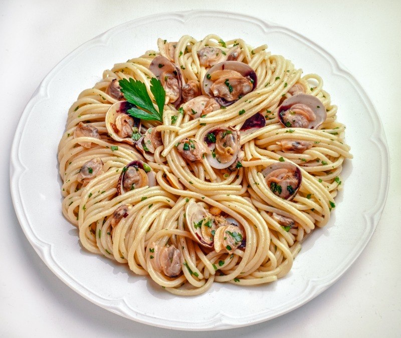 Spaghetti alle vongole 400gr di spaghetti, 1Kg di vongole veraci o di lupini, 6 pomodorini pachino, mezzo bicchiere di vino bianco secco, olio, aglio, prezzemolo, peperoncino, sale, pepe