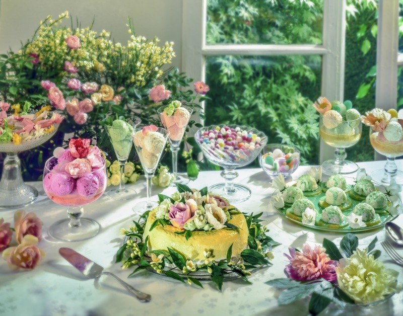 Sorbetto alla rosa, alla menta, al mandarino, allo champagne, gelato di ananas con crema al cocco
