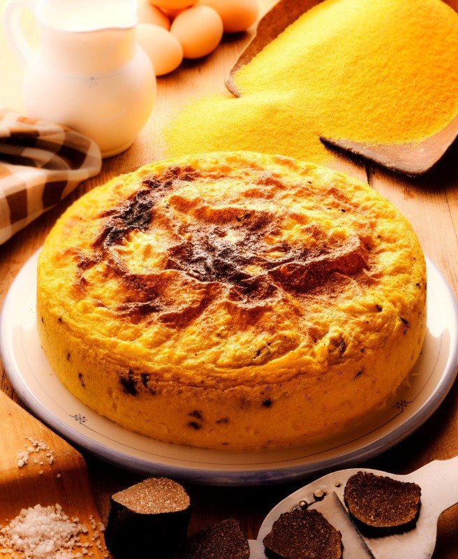 TORTA D’ORO AI TARTUFI Torta gialla di tartufi PIZZA DI FARINA GIALLA (Umbria) Ingredienti: 150 g di farina gialla, 3/4 di l di latte, 5 uova, 1/2 dl d’olio d’oliva, burro parmigiano grattugiato, uno o due tartufi neri, sale, pepe. Nel latte in ebollizione, leggermente salato, versate l…